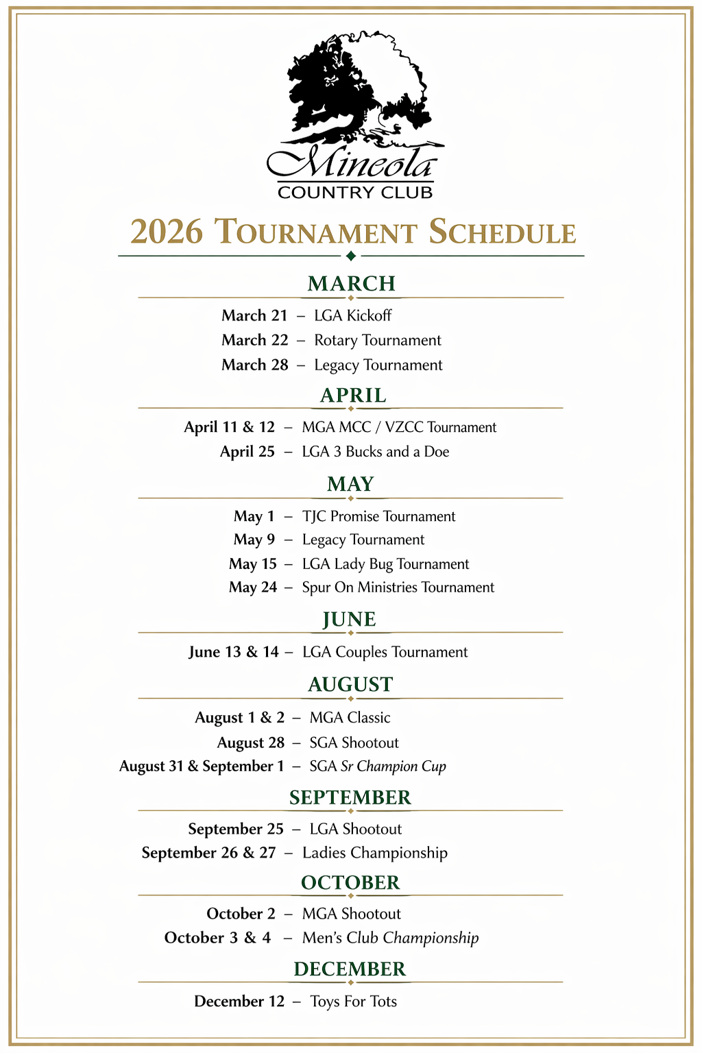 There are many club sponsored tournaments throughout the year including a Flag Tournament on July 4th, a Day/Night Tournament, a Legacy Tournament, as well as Friday night scrambles and last Sunday scrambles. The 3 organizations also have various tournaments throughout the year for all to enjoy. You do not have to be a seasoned golfer to participate in these events. Open to everyone!